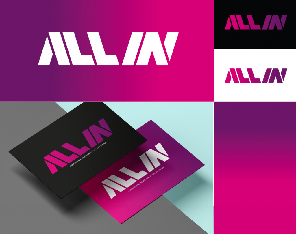 Für die ALL IN Group wurde ein neues Logo und eine neue Brand Identity gestaltet. Die Marke umfasst mehrere Untermarken, deren Tätigkeiten als Gesamtheit in dem Logo aufgegriffen werden sollten.
