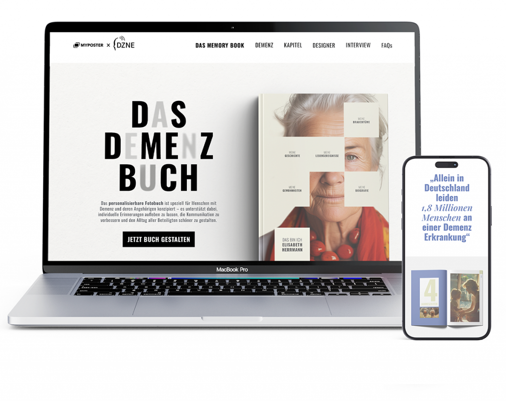 Zusammen mit dem Deutschen Zentrum für Neurodegenerative Erkrankungen e. V. (DZNE) hat MYPOSTER ein Fotobuch, speziell für Menschen mit Demenz entwickelt. Das Design und der Aufbau des Buches ist besonders auf die Betroffenen und Ihre Angehörigen ausgelegt.