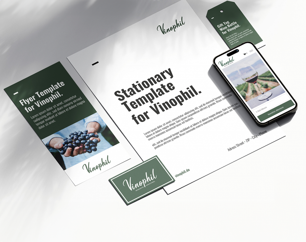 Dies habe ich in den Brandguidelines festgehalten und so das Aussehen von Vinophil festgelegt. Ich habe das Logo entwickelt, die Farben und die Schrift definiert sowie der Marke ein Gesicht, mittels einer Bildwelt, gegeben. Angewandt wurde der neue Look von mir in der Geschäftsausstattung, wie Visitenkarten, Brief- und Präsentationsvorlagen sowie Anhängern und Flyern.
